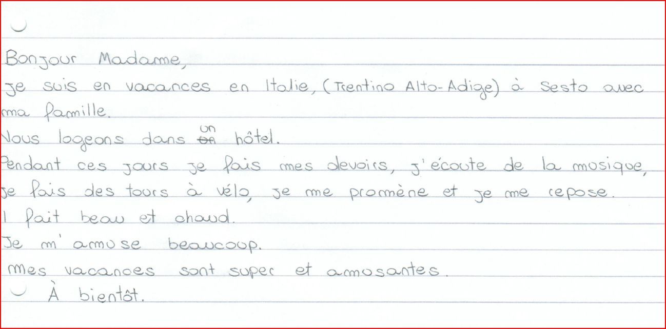 je suis en vacances en Italie à Rovetta (Bg) avec ma famille. Nous avons un appartement dans un immeuble de trois étages; notre appartement est au premier étage. En ces jours je me promène à la montagne et je joue avec mon frère dans le jardin. À Rovetta il y a le soleil. Mes vacances sont super.
