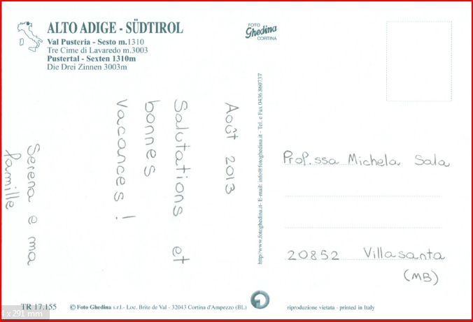 je suis en vacances en Italie à Cavalese avec ma famille.