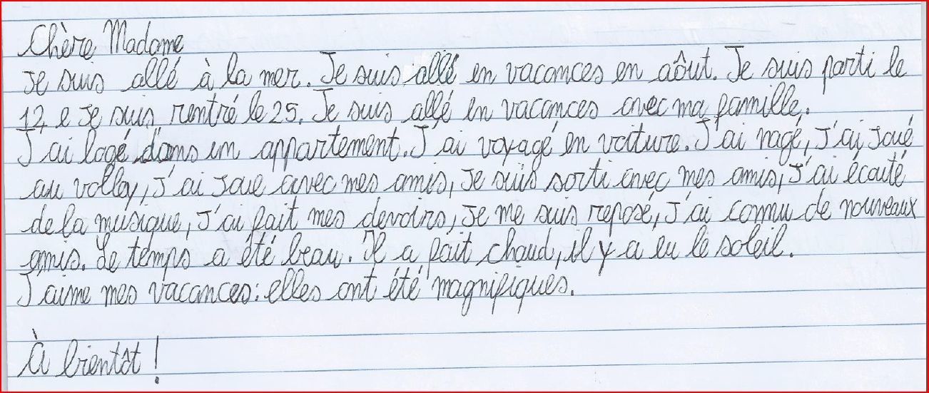 Je suis allé à la mer. Je suis allé en vacances en juin. Je suis parti le 25 août et je suis rentré le 3 septembre. Je suis allé en vacances avec ma famille. J'ai logé dans une villa. J'ai voyagé en avion. J'ai nagé, je me suis bronzé, j'ai écouté de la musique, j'ai fait mes devoirs et je me suis reposé. Le temps a été beau. Il a fait chaud il y a eu le soleil. J'ai aimé mes vacances : elles ont été extraordinaires.
